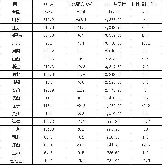 2017年截至 11月底,全國(guó) 6000千瓦及以上電廠裝機(jī)容量 16.8億千瓦,同比增長(zhǎng) 7.2%,增速比上年同期回落 3.2 個(gè)百分點(diǎn)。其中,水電 3.0億千瓦、火電 10.9 億千瓦、核電 3582 萬(wàn)千瓦、并網(wǎng)風(fēng)電 1.6 億千瓦。11 月份,全國(guó)規(guī)模以上電廠火電發(fā)電量 3762 億千瓦時(shí),同比下降 1.4%。 1-11 月份,全國(guó)規(guī)模以上電廠火電發(fā)電量 41728 億千瓦時(shí),同比增長(zhǎng) 4.7%,增速比上年同期提高 2.5 個(gè)百分點(diǎn)。分省份看,全國(guó)僅北京(-10.7%)、山東(-4.0%)、海南(-3.2%)、云南(-2.6%)、黑龍江(-0.5%)和遼寧(-0.2%)負(fù)增長(zhǎng),其他 25 個(gè)火電發(fā)電量正增長(zhǎng)的省份中,寧夏(23.0%)和福建(20.7%)增速超過(guò) 20%,廣東(13.1%)和江西(12.6%)增速超過(guò) 10%。