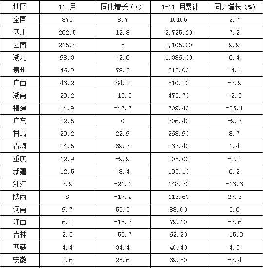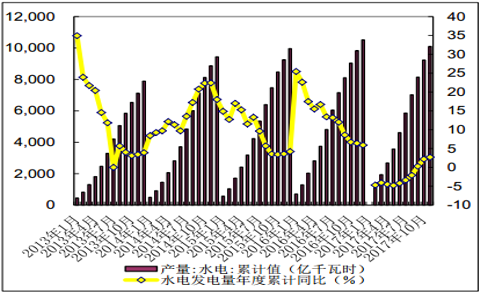 2017年11 月份,全國(guó)規(guī)模以上電廠水電發(fā)電量 873 億千瓦時(shí),同比增長(zhǎng) 8.7%。1-11月份,全國(guó)規(guī)模以上電廠水電發(fā)電量 10105億千瓦時(shí),同比增長(zhǎng) 2.7%,增速比上年同期回落 3.7 個(gè)百分點(diǎn)。全國(guó)水電發(fā)電量前三位的省份為四川(2725 億千瓦時(shí))、云南(2105 億千瓦時(shí))和湖北(1386 億千瓦時(shí)),其合計(jì)水電發(fā)電量占全國(guó)水電發(fā)電量的61.5%,同比分別增長(zhǎng) 7.2%、 9.9%和 6.4%。