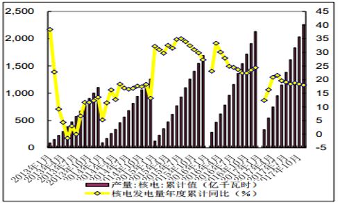 2017年11 月份,全國(guó)核電發(fā)電量 223 億千瓦時(shí),同比增長(zhǎng) 14.7%。 1-11月份,全國(guó)核電發(fā)電量 2259 億千瓦時(shí),同比增長(zhǎng) 18.0%,增速比上年同期回落 5.5 個(gè)百分點(diǎn)。