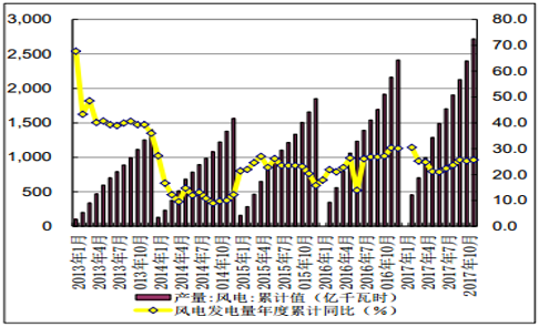 2017年11 月份,全國(guó) 6000 千瓦及以上風(fēng)電廠發(fā)電量 327 億千瓦時(shí),同比增長(zhǎng) 31.0%。 1-11 月份,全國(guó) 6000 千瓦及以上風(fēng)電廠發(fā)電量2717 億千瓦時(shí),同比增長(zhǎng) 25.6%,增速比上年同期回落 4.7 個(gè)百分點(diǎn)。