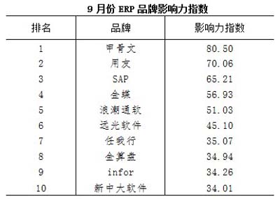 9月份ERP品牌媒體關(guān)注度指數(shù)