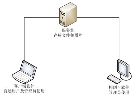 超級(jí)圖庫管理軟件經(jīng)過簡(jiǎn)單的定制后,形成了《電力監(jiān)理業(yè)務(wù)在線管理系統(tǒng)》軟件。該軟件由服務(wù)器、控制臺(tái)、客戶端三部分組成,如下圖所示。