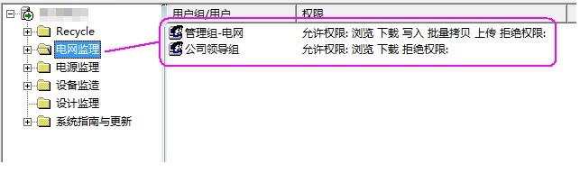 “管理組-電網(wǎng)”對(duì)整個(gè)“電網(wǎng)監(jiān)理”文件夾都有瀏覽、下載、寫入、批量拷貝、上傳的權(quán)限。而“公司領(lǐng)導(dǎo)組”沒有寫入的權(quán)限,只有瀏覽和下載的權(quán)限。這是因?yàn)楣绢I(lǐng)導(dǎo)只需要看到這些文件即可,不需要上傳。