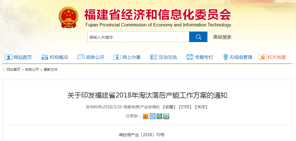 《福建省2018年淘汰落后產(chǎn)能工作方案》 于年底拆除列入年度淘汰計劃的落后產(chǎn)能主體設(shè)備及生產(chǎn)線