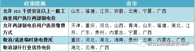 表1已出臺降低一般工商業(yè)電價政策省市一覽表