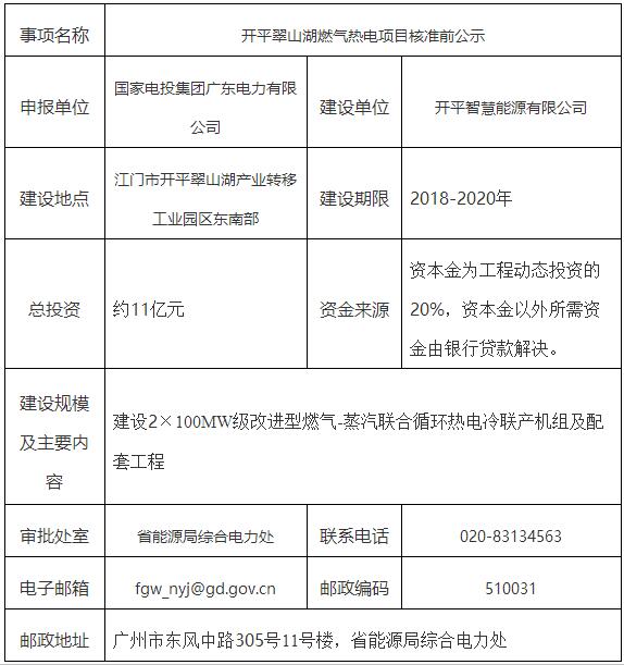 一、開平翠山湖燃氣熱電項目核準前公示