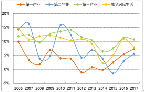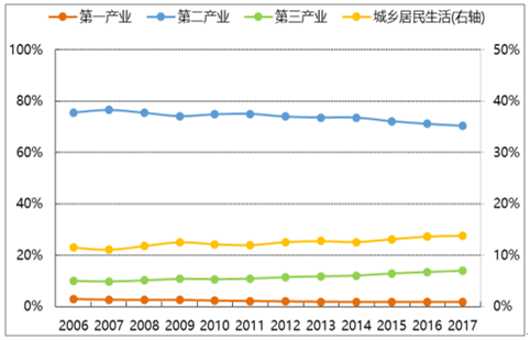 2006-2017年,全社會用電量同比增速呈階梯狀下降趨勢,和第二產(chǎn)業(yè)用電量增速近乎嚴格正相關(guān)。雖然,第二產(chǎn)業(yè)用電量占比逐年下降,仍處在 70%左右,是影響全社會用電量的絕對主力。第二產(chǎn)業(yè)的主體是制造業(yè),其中用電量占比較高的為:紡織業(yè)、化學(xué)原料及化學(xué)制品制造業(yè)、橡膠和塑料制品業(yè)、非金屬礦物制品業(yè)、黑色金屬冶煉及壓延加工業(yè)、有色屬冶煉及壓延加工業(yè)、金屬制品業(yè)、通用及專用設(shè)備制造業(yè)、交通運輸、電氣、電子設(shè)備制造業(yè)。