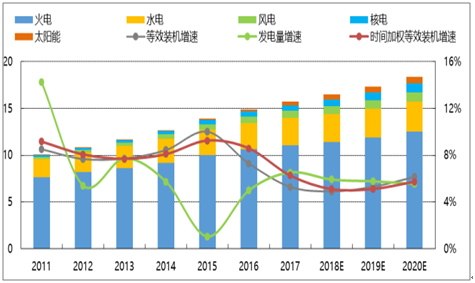 2018-2019 年發(fā)電設(shè)備利用率有望逐年改善, 2020 年小幅回落。 2014 年以來等效火電裝機和時間加權(quán)等效火電裝機增速均高于發(fā)電量增速,發(fā)電設(shè)備利用率逐年降低。 2017 年底等效火電裝機容量 15.7 億千瓦,同比增速 5.3%,時間加權(quán)同比增速 6.3%,低于發(fā)電量增速 6.5%,發(fā)電設(shè)備利用率開始改善。根據(jù)我們電力供應(yīng)預(yù)測數(shù)據(jù)測算得到,2018-2020 年時間加權(quán)等效火電裝機增速分別為 5.1%、 5.1%、 5.7%,發(fā)電量增速分別為 5.9%、 5.8%、 5.6%。因此,2018-2019 年發(fā)電設(shè)備利用率料將較 2017 年逐年改善, 2020 年或?qū)⒃?2019 年的基礎(chǔ)上小幅回落。