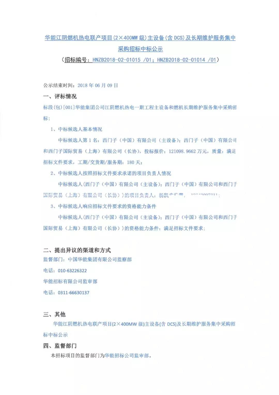 6月12日,華能江陰燃機熱電聯(lián)產(chǎn)項目(2×400MW級)主設(shè)備(含DCS)及長期維護服務(wù)集中采購招標中標公示: