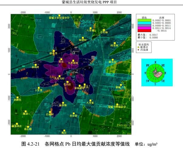 正常排放情況下,環(huán)評(píng)對(duì)PM10、TSP、SO2、NO2、HCl、Pb、二噁英、NH3、H2S的小時(shí)濃度、日均濃度、年均濃度值進(jìn)行了預(yù)測(cè);非正常排放情況,對(duì)SO2、HCl、二噁英、NH3 和H2S的小時(shí)濃度進(jìn)行了預(yù)測(cè)。前楊新村、七里吳等26個(gè)敏感點(diǎn)未出現(xiàn)超標(biāo)結(jié)果。