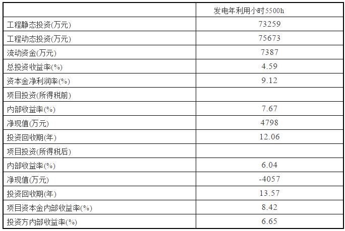 按照機組運營期20年,目前上網(wǎng)電價584元/MWh(含稅)的條件下,計算本項目的主要經(jīng)濟指標如下: