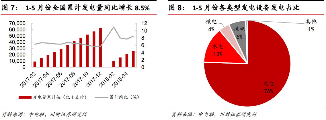 發(fā)電量方面:2018 年 1-5 月份,全國規(guī)模以上電廠發(fā)電量 26361 億千瓦時,同比增長 8.5%,增速比上年同期提高 2.1 個百分點(diǎn);火電發(fā)電量 19914 億千瓦時,同比增長 8.1%,增速比上年同期提高 0.9 個百分點(diǎn);水電發(fā)電量 3553 億千瓦時,同比增長 2.7%,增速比上年同期提高 7.5 個百分點(diǎn);核電發(fā)電量 1063 億千瓦時,同比增長 11.3%,增速比上年同期回落 10.3 個百分點(diǎn);風(fēng)電發(fā)電量 1674 億千瓦時,同比增長 30.2%,增速比上年同期提高 9.0 個百分點(diǎn)。受益于用電負(fù)荷的增長,全國發(fā)電量保持較快增長,今年以來來水情況較去年同期稍好,水電發(fā)電量同比增加,5 月份用電增速超預(yù)期,作為最大負(fù)荷的火電發(fā)電量增速回升。
