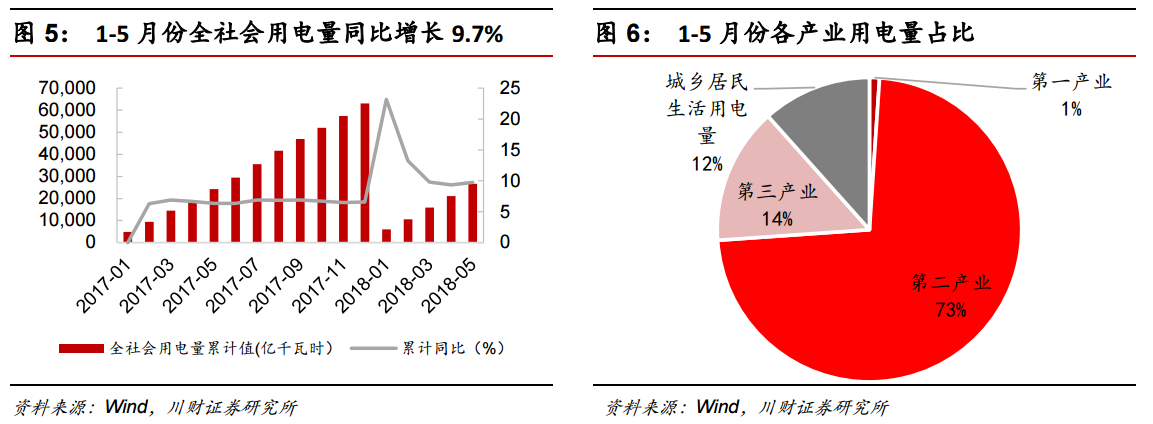 用電量方面:2018 年 1-5 月份,全國全社會用電量 26628 億千瓦時,同比增長 9.7%,增速比上年同期提高 3.4 個百分點(diǎn);分產(chǎn)業(yè)看,1-5 月份,第一產(chǎn)業(yè)用電量 263 億千瓦時,同比增長 10.6%,對全社會用電量增長的貢獻(xiàn)率為 1.1%,占全社會用電量的比重為 1.0%;第二產(chǎn)業(yè)用電量 18295 億千瓦時,同比增長 7.7%,占全社會用電量的比重為 68.7%,對全社會用電量增長的貢獻(xiàn)率為 55.6%,占全社會用電量的比重為 72.8%;第三產(chǎn)業(yè)用電量 4181 億千瓦時,同比增長 15.1%,占全社會用電量的比重為 15.7%,對全社會用電量增長的貢獻(xiàn)率為 23.2%,占全社會用電量的比重為 14.5%,;城鄉(xiāng)居民生活用電量 3889 億千瓦時,同比增長 13.9%,占全社會用電量的比重為 14.6%,對全社會用電量增長的貢獻(xiàn)率為 20.1%,占全社會用電量的比重為 11.6%??傮w來看,全社會用電量累計(jì)增速同比提高,三產(chǎn)和城鄉(xiāng)居民用電快速增長;工業(yè)用電量較快增長,制造業(yè)日均用電量再創(chuàng)歷史新高。