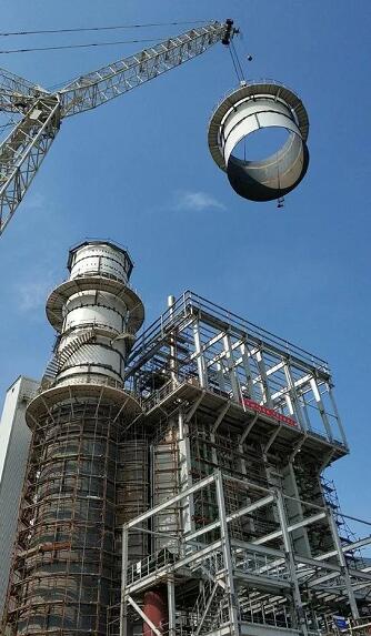 周口燃?xì)怆姀S工程項(xiàng)目2號(hào)余熱鍋爐鋼煙囪最后一個(gè)組件順利吊裝就位