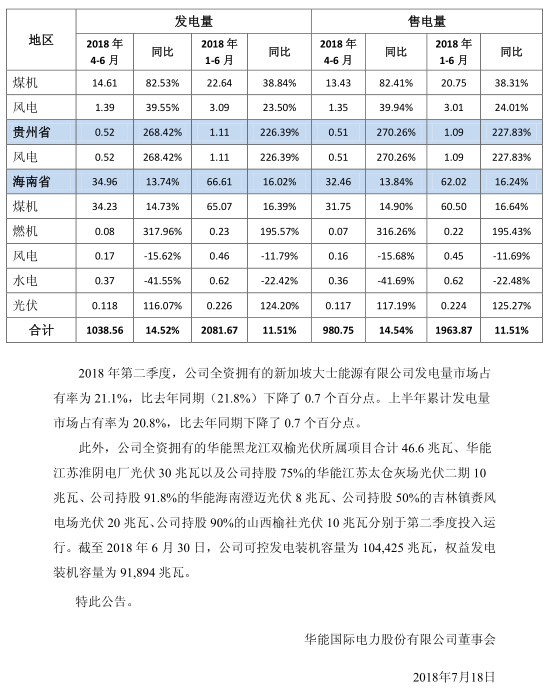 近日,華能集團旗下華能國際發(fā)布了2018年上半年發(fā)電量等經(jīng)營性情況,詳情如下: