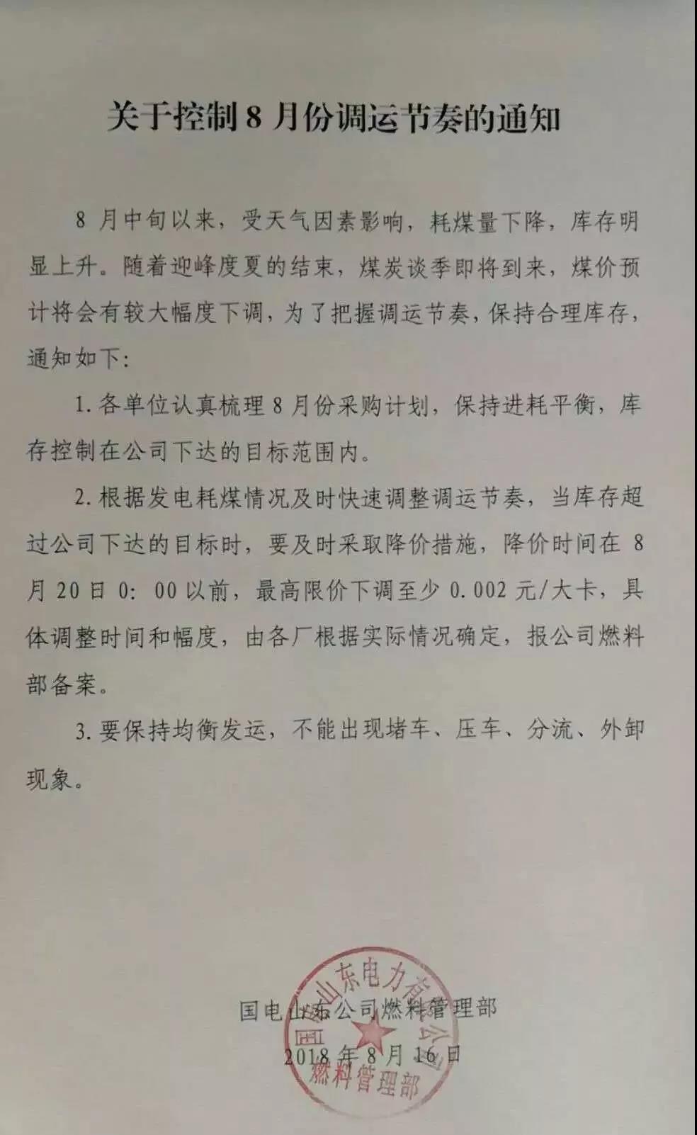 今日智庫在最新得到的一份“關(guān)于控制8月份調(diào)運(yùn)節(jié)奏的通知”文件中獲悉,國電近日已經(jīng)要求其所屬企業(yè)在煤炭淡季來臨前,把握好調(diào)運(yùn)節(jié)奏,保持煤炭進(jìn)耗平衡,將庫存控制在公司下達(dá)的目標(biāo)范圍之內(nèi);更為重要的一點(diǎn)是,當(dāng)庫存超過公司下達(dá)的目標(biāo)時(shí),各單位在采購中要及時(shí)采取降價(jià)措施,最高限價(jià)下調(diào)至少0.002元/大卡。此外,為了避免出現(xiàn)集中采購?fù)聘呙簝r(jià)的現(xiàn)象,還要求各單位保持均衡發(fā)運(yùn),不能出現(xiàn)堵車、壓車、分流、外卸現(xiàn)象。