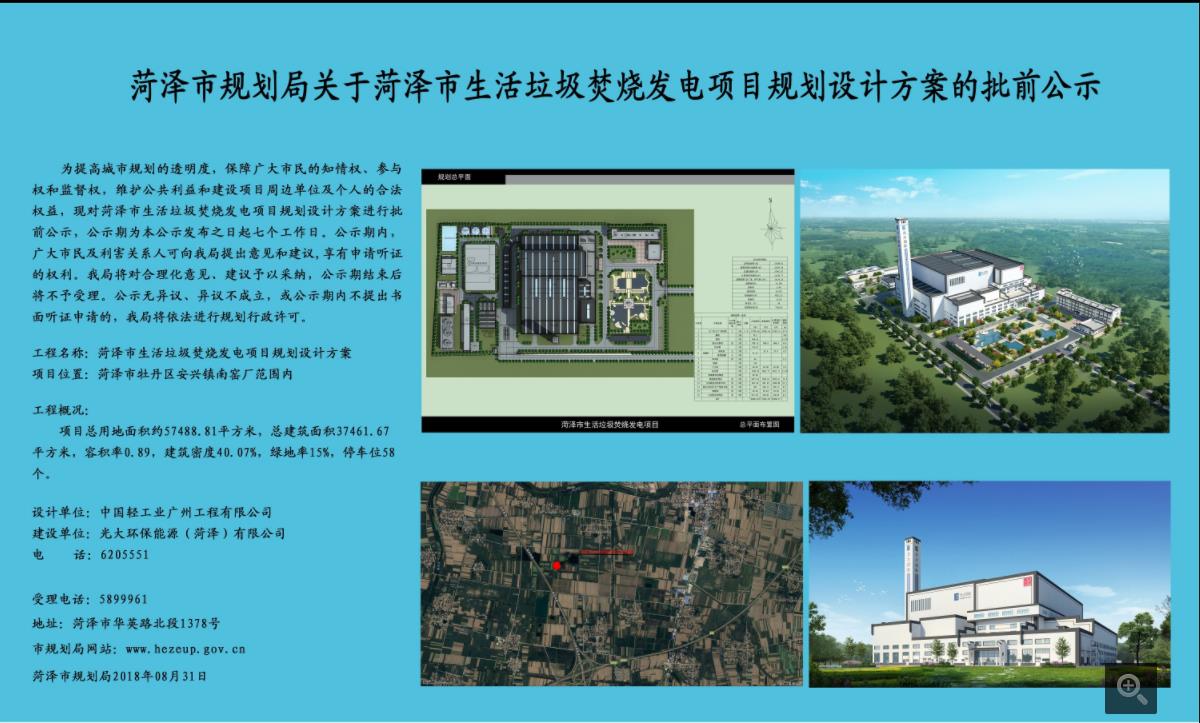 該項目由中國輕工業(yè)廣州工程有限公司設(shè)計,由光大環(huán)保能源(菏澤)有限公司建設(shè),廣大市民可在本公示發(fā)布七個工作日內(nèi),向菏澤市規(guī)劃局提出意見和建議,享受申請聽證的權(quán)利,菏澤市規(guī)劃局將對合理化意見、建議予以采納,公示期結(jié)束后將不予受理,公示無異議、異議不成立,或公示期內(nèi)不提出書面聽證申請的,菏澤市規(guī)劃局將依法進行規(guī)劃行政許可。