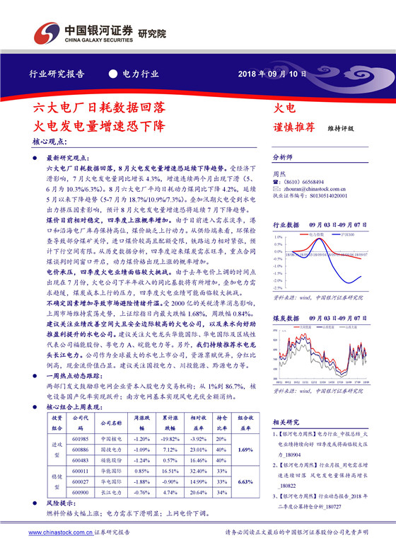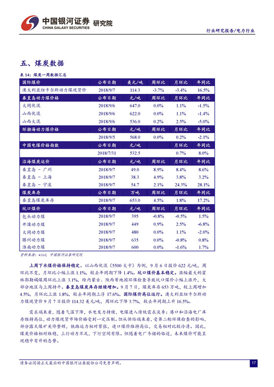 六大電廠日耗數(shù)據(jù)回落, 8 月火電發(fā)電量增速恐延續(xù)下降趨勢(shì)。 受經(jīng)濟(jì)下滑影響, 7 月火電發(fā)電量同比增長(zhǎng) 4.3%,增速連續(xù)兩個(gè)月出現(xiàn)下滑( 5、6 月為 10.3%/6.3%)。 8 月六大電廠平均日耗動(dòng)力煤同比下降 4.2%,延續(xù)5 月以來(lái)下降趨勢(shì)( 5-7 月為 18.7%/10.9%/7.3%)。疊加汛期火電受到水電出力擠壓因素影響,預(yù)計(jì) 8 月火電發(fā)電量增速恐將延續(xù) 7 月下降趨勢(shì)。煤價(jià)目前相對(duì)穩(wěn)定,四季度上漲概率增加。 由于目前進(jìn)入需求淡季,港口和沿海電廠庫(kù)存保持高位,煤價(jià)缺乏上行動(dòng)力。從供給端來(lái)看,環(huán)保檢查導(dǎo)致部分煤礦關(guān)停,進(jìn)口煤價(jià)較高且配額受限,鐵路運(yùn)力相對(duì)緊張,預(yù)計(jì)下行空間有限。從歷史數(shù)據(jù)分析,四季度迎來(lái)煤炭需求旺季,重點(diǎn)合同煤談判時(shí)間窗口開啟,動(dòng)力煤價(jià)格出現(xiàn)上漲的概率增加。