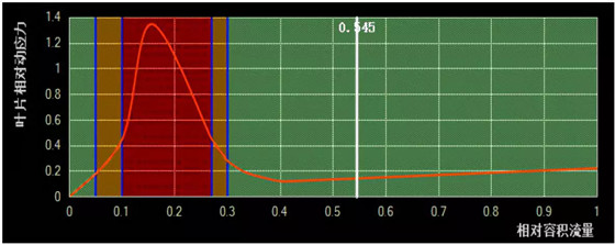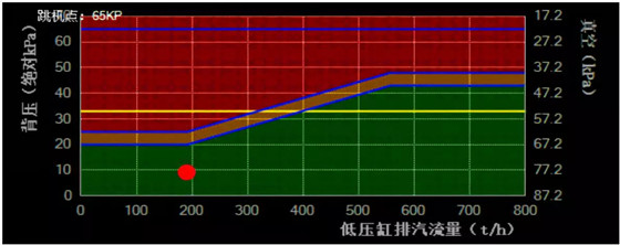 機組在高背壓不抽汽工況下,低壓缸的流量和排汽流量較大,機組可以安全運行,但是天氣較冷時,為提高熱網(wǎng)循環(huán)水的供水溫度,需要從汽輪機抽汽在熱網(wǎng)首站對通過凝汽器后的熱網(wǎng)循環(huán)水進行二次加熱,隨著抽汽量的增加,低壓缸的排汽量隨之減少,抽汽量越大,進入低壓缸的排汽量減少越多,當(dāng)接近某臨界值時,排汽流量達到設(shè)計流量的30%以下時報警,如果背壓再升高,容積流量會減少,當(dāng)達到額定排氣流量的28%以下時,會進入低壓缸末級葉片的顫振區(qū),此時葉片隨時會疲勞而斷裂,對機組安全運行帶來很大的隱患。根據(jù)廠家提供背壓限制曲線、末級葉片特性和有關(guān)要求,結(jié)合同類型直接空冷機組改造狀況,開發(fā)了汽輪機低壓缸末級葉片安全監(jiān)控系統(tǒng),對機組顫振值圖形化顯示,詳見圖2.2-1、2和3。便于運行人員監(jiān)控、調(diào)整,保證機組安全運行。