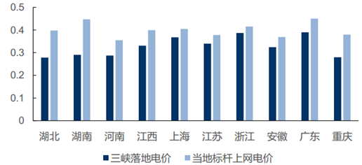 三峽水電落地電價(jià)與多個(gè)省份當(dāng)?shù)鼗痣姌?biāo)桿電價(jià)對(duì)比