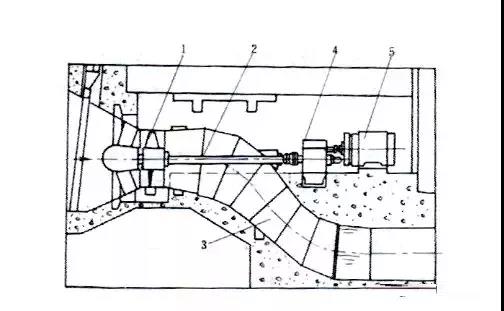 1—轉(zhuǎn)輪;2—水輪機主軸;3—尾水管;4—齒輪轉(zhuǎn)動機構(gòu);5—發(fā)電機