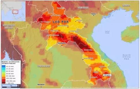 老撾南部地區(qū)的桑片-桑南內(Xe Pian-Xe Namnoy)水電站桑南內水庫(庫容10.43億m3)D副壩潰壩產生約6億m3潰壩洪水。截至7月30日,已有27人死亡,123人失蹤,16,000人受到影響,搜救行動仍在進行中。東盟人道主義求援中心(ASEAN Coordinating Centre for Humanitarian Assistance)7月30日報道稱:根據(jù)對Sanamxay地區(qū)的最新衛(wèi)星觀測,約42.36km2仍然被洪水淹沒,其中農田面積32.53km2;洪水淹沒區(qū)域范圍內,共有302座建筑物和31.5km道路仍浸沒在洪水中。根據(jù)被淹沒建筑物高度分析,淹沒區(qū)域水深約為5-10米(如圖1)。根據(jù)天氣預報,8月上旬該地區(qū)仍有大范圍降雨(如圖2),洪水難以如期望那樣快速消退。