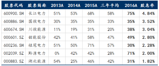長(zhǎng)期看水電企業(yè)新增在建工程規(guī)模減小,預(yù)計(jì)資本金支出減少進(jìn)入現(xiàn)金回流期,有望維持高比例分紅。長(zhǎng)江電力:對(duì)2016至2020年每年度的利潤(rùn)分配按每股不低于0.65元進(jìn)行現(xiàn)金分紅;對(duì)2021至2025年每年度的利潤(rùn)分配按不低于當(dāng)年實(shí)現(xiàn)凈利潤(rùn)的70%進(jìn)行現(xiàn)金分紅。