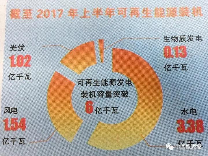 一是推動(dòng)能源結(jié)構(gòu)調(diào)整的作用不斷增強(qiáng)。到2017年上半年,我國(guó)可再生能源發(fā)電裝機(jī)容量突破6億千瓦。其中,水電裝機(jī)3.38億千瓦,風(fēng)電并網(wǎng)裝機(jī)1.54億千瓦,光伏發(fā)電并網(wǎng)裝機(jī)1.02億千瓦,生物質(zhì)發(fā)電并網(wǎng)裝機(jī)1330萬(wàn)千瓦。