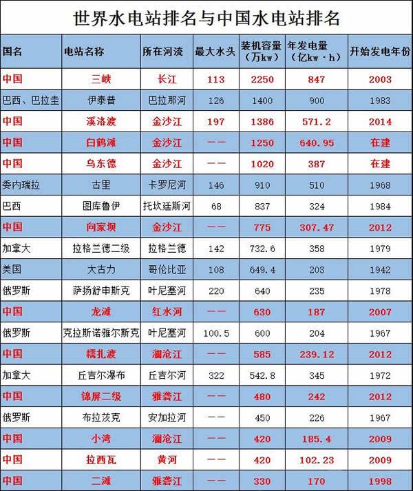 在之后的100余年的時間里,水電逐漸成為僅次于火力發(fā)電的第二大電源,在法國、瑞士等國家的水能資源利用率已經(jīng)達到97%。但從中國瞄上水電并有能力自主建設水電之后,一項項世界紀錄便信手拈來,時至今日,中國水電裝機容量和發(fā)電量分別達到33211萬千瓦和10518.40億千瓦時,穩(wěn)居世界第一,在世界排名前20的水電站中,“中國造”獨占11,繼橋梁之后再次屠版。