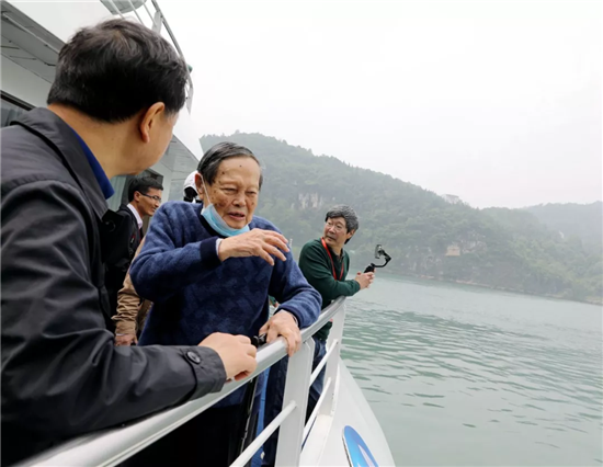 4月26日上午,一艘輪船緩緩從葛洲壩黃草壩碼頭起航,溯江而上前往三峽。楊振寧院士坐在船頭,興趣盎然地與隨行人員交流著。