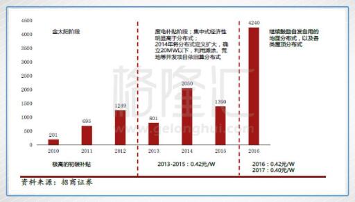 發(fā)改委2016年12月6日發(fā)文表明,2017年1月1日之后,一至三類資源分別調(diào)整為0.65元/0.75元/0.85元,同時(shí)表示今后光伏標(biāo)桿電價(jià)根據(jù)成本變化情況每年調(diào)整一次。從2015年到2017年光伏標(biāo)桿電價(jià)共下調(diào)0.25元/0.2元/0.15元,導(dǎo)致了集中式光伏以0.65元每千瓦的價(jià)格對(duì)比0.6元以上的成本,利潤(rùn)變得很薄。而另一方面,分布式由于不占用土地,純并網(wǎng)發(fā)電成本僅為0.55元左右,分布式實(shí)行0.42元/kWh的度電補(bǔ)貼政策,這個(gè)標(biāo)準(zhǔn)自2013年確定,迄今未做調(diào)整,加上各地還有地方補(bǔ)貼,分布式光伏的補(bǔ)貼力度比起集中式有著天淵之別。隨著陸上風(fēng)電、集中式光伏補(bǔ)貼水平不斷下調(diào),分布式光伏補(bǔ)貼下調(diào)或許未來會(huì)到來,而這樣的預(yù)期,將會(huì)直接刺激分布式光伏的搶裝熱潮。
