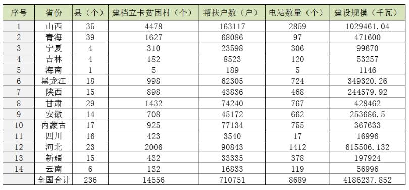 2017年12月29日,國家能源局與扶貧辦發(fā)布了《關于下達“十三五”第一批光伏扶貧項目計劃的通知》,如期將第一批扶貧項目指標在在2017年的最后幾天進行了公布,涉及14個省(自治區(qū))、236個光伏扶貧重點縣的總規(guī)模4186.237852MW的光伏扶貧項目獲得批準,面向的扶貧對象為14556個建檔立卡貧困村的71.0751萬戶建檔立卡貧困戶。