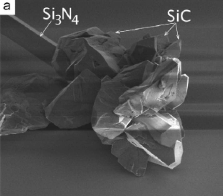 將這些團(tuán)簇狀陰影部分用強(qiáng)酸溶解后,很容易會(huì)得到一些不容物,這些不容物或是呈現(xiàn)黑色塊狀,或是桿狀黃色透明,兩者常常在共生存在,這些通常都被稱(chēng)作硬質(zhì)夾雜(inclusions)。有研究表明這些黑色塊狀為夾雜相為β-SiC,黃色透明桿狀?yuàn)A雜相為β-Si3N4。