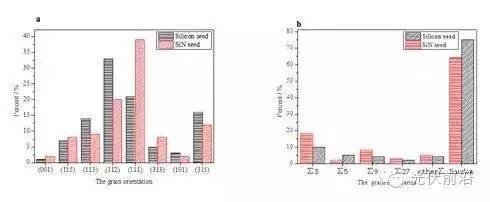 (2)有籽晶高效多晶硅技術(shù)生長硅錠底部晶粒晶向分布{112}晶向占主導(dǎo),隨機(jī)晶界比例相對較高,硅錠底部晶體品質(zhì)優(yōu)勢較大。