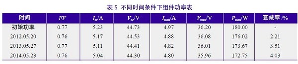 分析本文對(duì)某研究所光伏電站進(jìn)行跟蹤測(cè)試分析,選取一塊質(zhì)量正常的組件定期進(jìn)行功率測(cè)試,其功率衰減數(shù)據(jù)見表5。