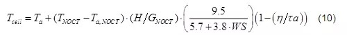 電池片溫度的計算對于溫度修正系數(shù)非常重要,除上述介紹的NOCT法、Sandia經(jīng)驗公式法外,文獻【3】提到的還有一種方法和NOCT法比較相似,稱為Text Book法,不同之處是增加了風速影響因子,其公式為: