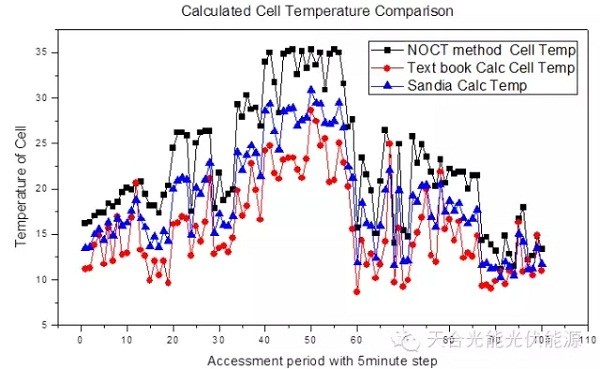 由于缺少實際測試數(shù)據(jù),這里對上述三種計算方法進行簡單比較,計算周期從冬季某日上午8點03分開始到16點18分結(jié)束,參考圖3,原始環(huán)境溫度和輻照數(shù)據(jù)從軟件中獲取了100個采集點(時間間隔5分鐘),其中數(shù)據(jù)的準確度可能和實際有點誤差,但這里并不影響各個方法的比較。從圖3計算結(jié)果可知,總體上NOCT法計算的值比Sandia法和Text Book法計算值要大一些,根據(jù)文獻【3】實測對比的結(jié)論,Text Book法計算的溫度和實際測試溫度偏離程度僅為4%左右,準確度較高,其次為Sandia法,但兩者計算值和實際值的偏離程度均在容許范圍之內(nèi)。