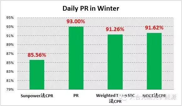 如果組件的加權(quán)平均工作溫度不以年為單位進行計算,比如計算周期就1天,那么PR和CPR的值是幾乎相同的。如表3列舉的數(shù)據(jù),如果以某冬季某一天的加權(quán)平均溫度計算,則CPR和PR都為93%,但如果以一年的電池加權(quán)平均溫度42°計算,那么PR和CPR就會出現(xiàn)差異,PR值會偏高。