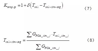 其中Tcell-sim-avg為以電站方陣平面接受輻射能量為權(quán)重的組件加權(quán)平均工作溫度,一般以一年為計算周期。因此高輻照的權(quán)重因子將比低輻照下的權(quán)重因子高,當輻照為0時,權(quán)重因子就變?yōu)?【4】【5】。