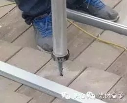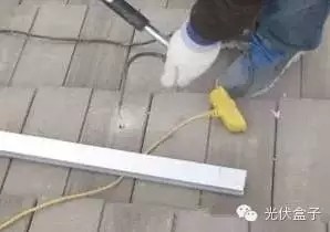 如圖6至圖9為瓦面屋頂從打孔到導(dǎo)軌安裝的施工過程,根據(jù)屋面實(shí)際情況和組件排布數(shù)量,膨脹螺栓安裝孔位的前后間距約1米左右,由于混凝土瓦面有一定厚度,瓦面和保溫層有幾厘米的距離,再打入現(xiàn)澆層后,總共深度約15cm左右,孔位開好之后需要將多余的混凝土土灰用鋼管氣筒清除干凈,灌注硅膠需要見到明顯的溢出為佳,膨脹螺栓和L支腳搭配好之后敲入孔內(nèi),橫梁和L支腳固定,最后在安裝孔位四周涂上防水膠,待半干燥后即可安裝光伏組件,參考圖10。