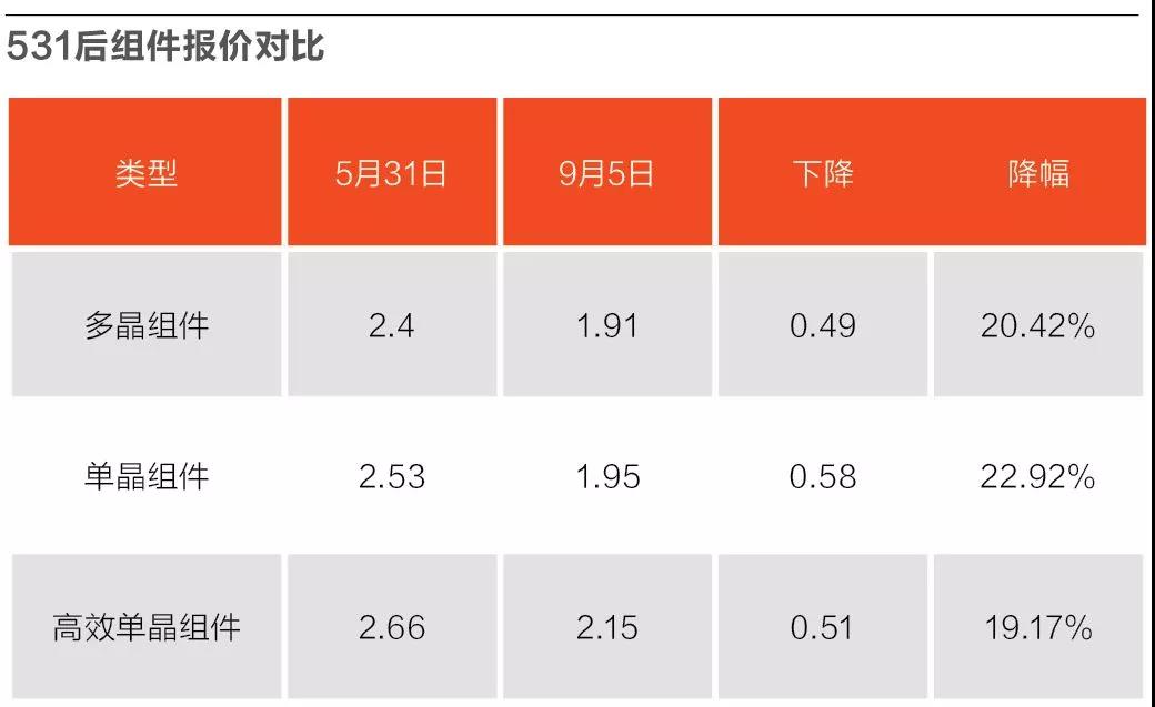 資深光伏行業(yè)研究員王淑娟對531后大量大型光伏項(xiàng)目的EPC中標(biāo)價(jià)格進(jìn)行統(tǒng)計(jì)后發(fā)現(xiàn),平均下降了1.1元/W,均價(jià)4.1元/W,降幅達(dá)到20%。同時(shí),531之后,各類光伏組件的平均價(jià)格也下降了0.5~0.6元/W,平均降幅為20%左右。