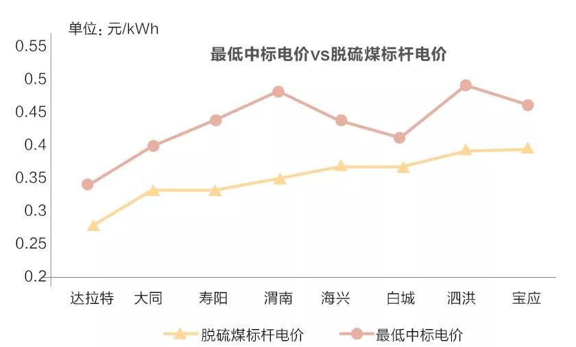 整體來看,與第二批領(lǐng)跑者相比,此次領(lǐng)跑者電價(jià)水平的降幅之大有目共睹。在第二批領(lǐng)跑者中,山西陽泉領(lǐng)跑基地的0.61元/kWh的中標(biāo)電價(jià)已屬最低電價(jià),而根據(jù)第三批領(lǐng)跑者的中標(biāo)結(jié)果,最低中標(biāo)電價(jià)與當(dāng)?shù)氐拿摿蛎簶?biāo)桿電價(jià)只相差3.6分/kWh。