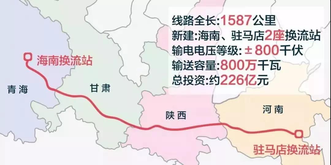 青海—河南特高壓工程起于青海省海南藏族自治州,止于河南省駐馬店市,途經(jīng)青海、甘肅、陜西、河南等4省,線路全長1587公里,新建海南、駐馬店2座換流站,輸電電壓等級為±800千伏,輸送容量800萬千瓦,總投資約226億元,于2018年10月獲得國家發(fā)改委核準(zhǔn),計(jì)劃2020年建成投運(yùn)。該工程是世界上首個(gè)以服務(wù)光伏發(fā)電為主、全清潔能源打捆外送的特高壓工程,是解決新能源大規(guī)模并網(wǎng)消納難題的重大創(chuàng)新工程和典范工程。