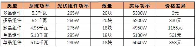 以5.3kW系統(tǒng)為例,其他功率的系統(tǒng)產(chǎn)生的價格差異見下表: