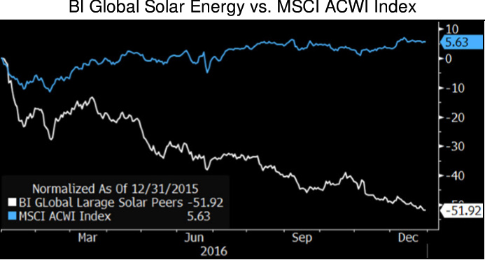 據(jù)彭博行業(yè)研究平臺(tái)消息,2016年,全球大型太陽(yáng)能行業(yè)集團(tuán)股價(jià)下跌幅度達(dá)52%,表現(xiàn)不佳,同期MSCIACWI指數(shù)上漲幅度為5.6%。美國(guó)光伏巨頭SunEdison在去年4月份提交破產(chǎn)保護(hù)申請(qǐng),加重了行業(yè)內(nèi)的消極情緒,與此同時(shí),美國(guó)住宅用太陽(yáng)能設(shè)備發(fā)展速度緩慢,2017年相關(guān)項(xiàng)目數(shù)量降低。除此之外,中美貿(mào)易持續(xù)的緊張局勢(shì)、中國(guó)2020年增長(zhǎng)目標(biāo)放緩以及去年下半年開始的國(guó)內(nèi)太陽(yáng)能設(shè)備需求放緩給那些面向中國(guó)市場(chǎng)的設(shè)備生產(chǎn)商帶來壓力,這些趨勢(shì)可能會(huì)持續(xù)到2017年。