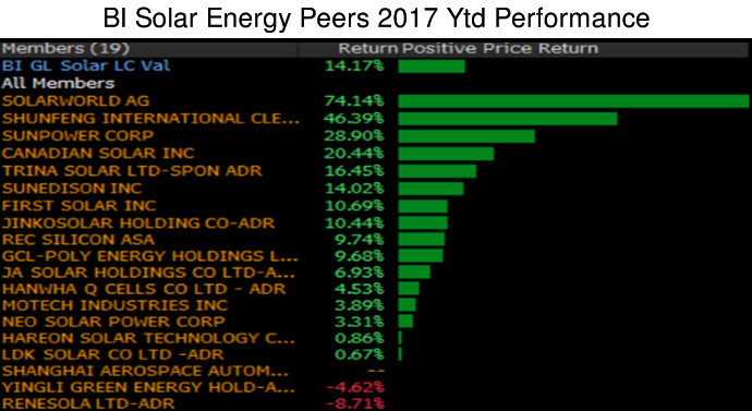 據(jù)彭博行業(yè)研究平臺(tái)數(shù)據(jù),繼2016年52%的下跌幅度之后,2017年前兩個(gè)月,太陽(yáng)能行業(yè)集團(tuán)股價(jià)上漲14%。太陽(yáng)能行業(yè)股市回暖,加之油價(jià)恢復(fù)到50美元左右,分析師的看法會(huì)有所改善。主要面向中國(guó)市場(chǎng)的順風(fēng)國(guó)際清潔能源有限公司(shunfeng international clean energy)和阿特斯陽(yáng)光電力集團(tuán)(CanadianSolar)寄希望于今年上半年中國(guó)太陽(yáng)能需求能夠增加。FirstSolar和SunPower等美國(guó)太陽(yáng)能同行公司采取的削減成本的舉措也可能會(huì)緩和業(yè)內(nèi)對(duì)價(jià)格和行業(yè)產(chǎn)能過剩的擔(dān)憂情緒。