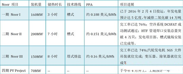 如圖所示,160MW的NoorI槽式光熱電站(3小時(shí)儲(chǔ)熱時(shí)長(zhǎng))已于2016年2月4日投運(yùn),電價(jià)為1.62迪拉姆/kWh,約合1.183人民幣/kWh;200MW的NoorII槽式光熱電站(7小時(shí)儲(chǔ)熱時(shí)長(zhǎng))的完工率已達(dá)76%;150MW的NoorIII塔式熔鹽光熱電站(8小時(shí)儲(chǔ)熱時(shí)長(zhǎng))的完工率也已達(dá)74%;今年4月,該項(xiàng)目第四階段(最后階段)的70MWNoorQuarzazateIV光伏電站正式動(dòng)工,這標(biāo)志著全部電站項(xiàng)目進(jìn)入建設(shè)階段。