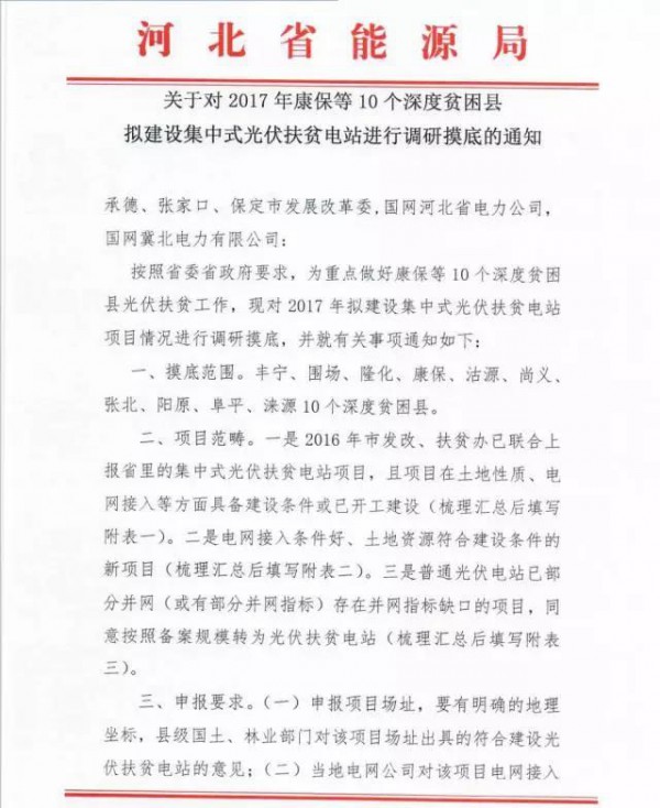 河北啟動對2017年康保等10個深度貧困縣擬建設(shè)集中式光伏扶貧電站進行調(diào)研摸底的通知