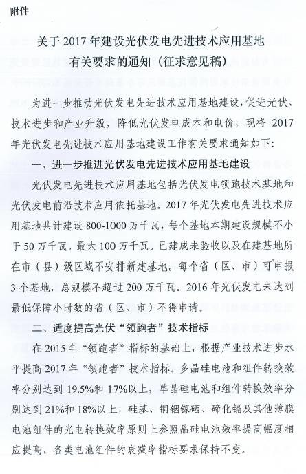 在5月16日國家能源局發(fā)布《關(guān)于2017年建設(shè)光伏發(fā)電先進技術(shù)應(yīng)用基地有關(guān)要求的通知》(征求意見稿)中,明確提出:2017年將新批復(fù)8~10GW的領(lǐng)跑者項目。