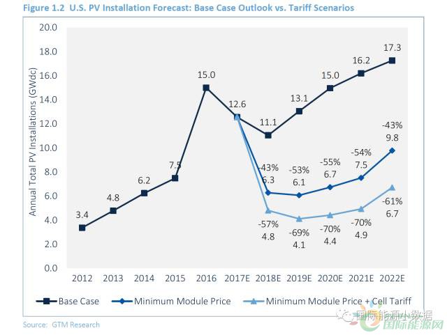 美國光伏制造商Suniva和SolarWorld兩家公司向美國國際貿(mào)易委員會和特朗普總統(tǒng)提出申請,要求所有光伏電池的進(jìn)口加收0.40美元/瓦的關(guān)稅,并且對多晶光伏組件設(shè)立0.78美元/瓦的最低進(jìn)口價。如果二者同時實施,那么美國光伏價格將達(dá)到1.18美元/瓦,回到2012年的水平。根據(jù)GTM Research的分析,如果對光伏組件進(jìn)口實施0.78美元/瓦的最低價格,那么美國的2018-2022年之間的預(yù)期的新增累計光伏裝機(jī)將從72.5吉瓦降至36.4吉瓦;如果再加上對光伏電池加收的0.40美元/瓦的關(guān)稅,那么在1.18美元/瓦的價格下,2018-2022年預(yù)期的新增累計裝機(jī)將降低至25吉瓦。也就是說,美國有可能損失高達(dá)47.5吉瓦的光伏安裝量,大致相當(dāng)于美國現(xiàn)有的光伏裝機(jī)容量。
